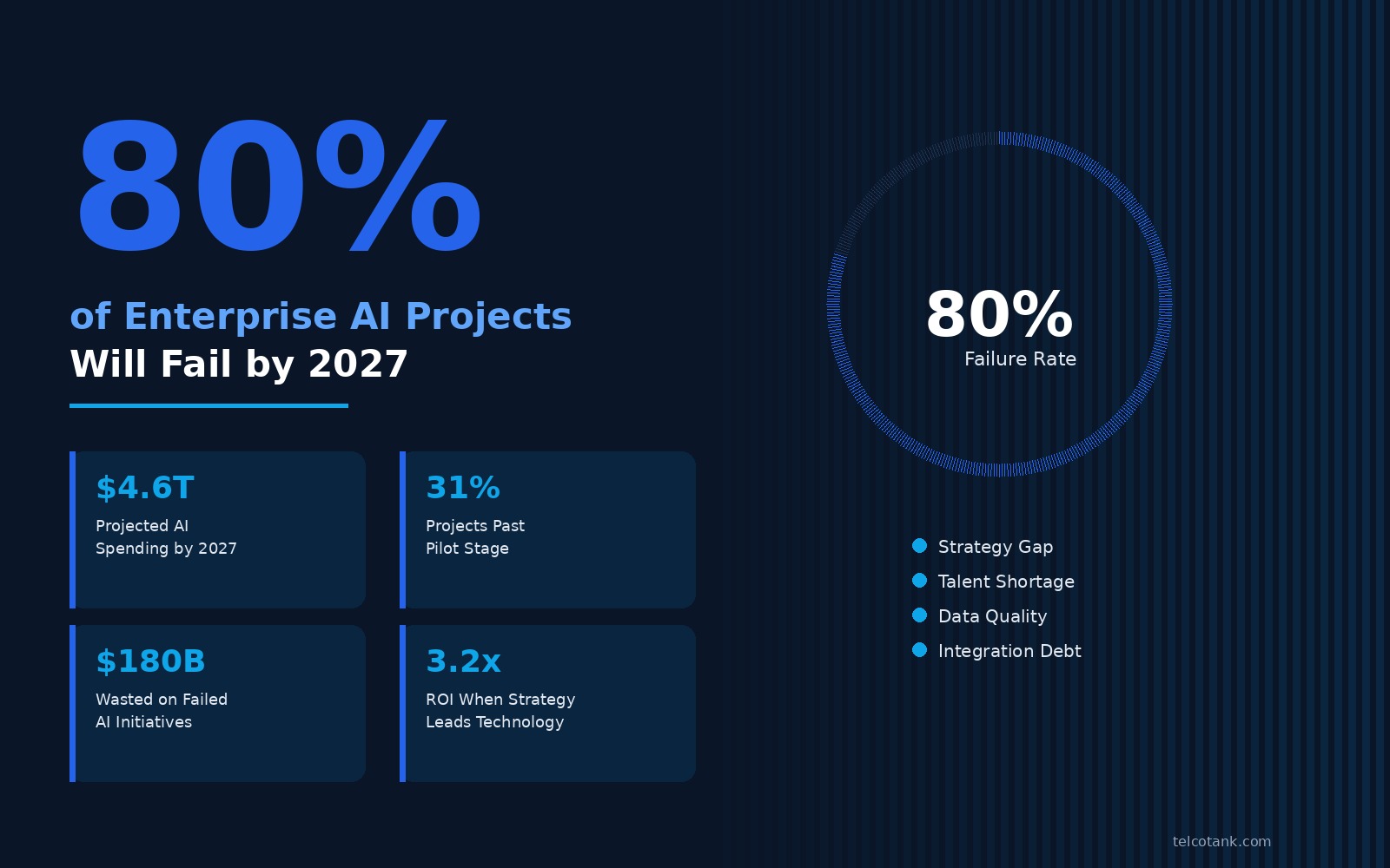 Уровень отказов корпоративного ИИ сегодня — это неудобная история, которую никто не хочет рассказывать. Организации потратили $4,6 триллиона на инициативы ИИ за последнее десятилетие, но метрики успеха неутешительны. Восемьдесят процентов этих проектов никогда не выходят из экспериментальной фазы. Они не терпят драматический отказ с пропущенными сроками или взорванными бюджетами — они просто исчезают в корпоративных силосах, заменяемые новыми инициативами, которые обещают трансформацию.