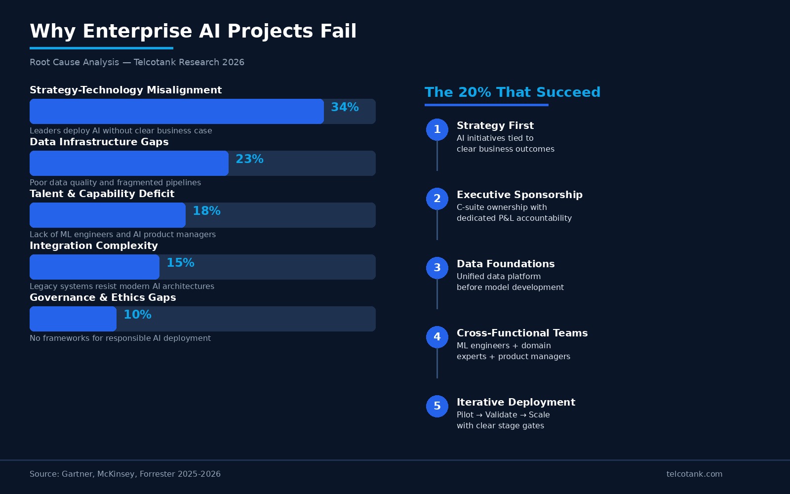Из всех проектов ИИ, которые мы отслеживали в крупных компаниях, те, что потерпели неудачу, демонстрируют последовательные закономерности. Первая простая: они начинают с технологии, а не со стратегии. Компания говорит "Давайте используем LLM" или "Давайте строить с трансформерами" и набирает команду инженеров ИИ. Три месяца спустя они спрашивают: "На самом деле, какую бизнес-проблему мы решаем?" К этому моменту уже слишком поздно.